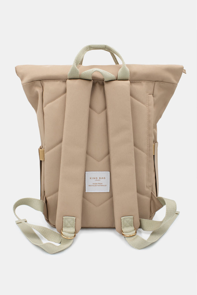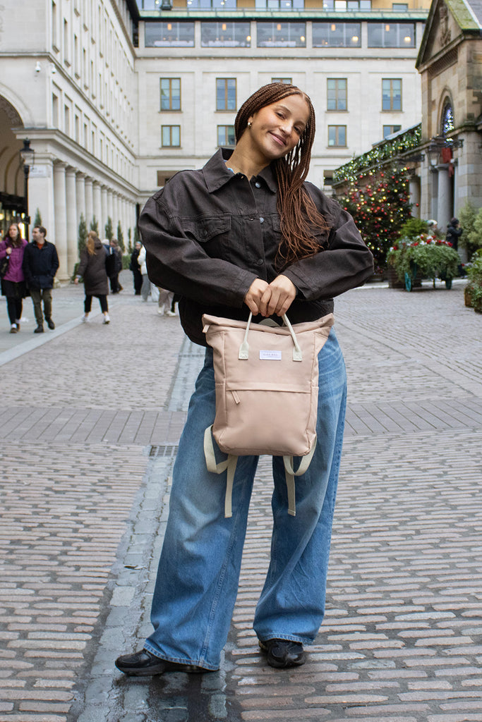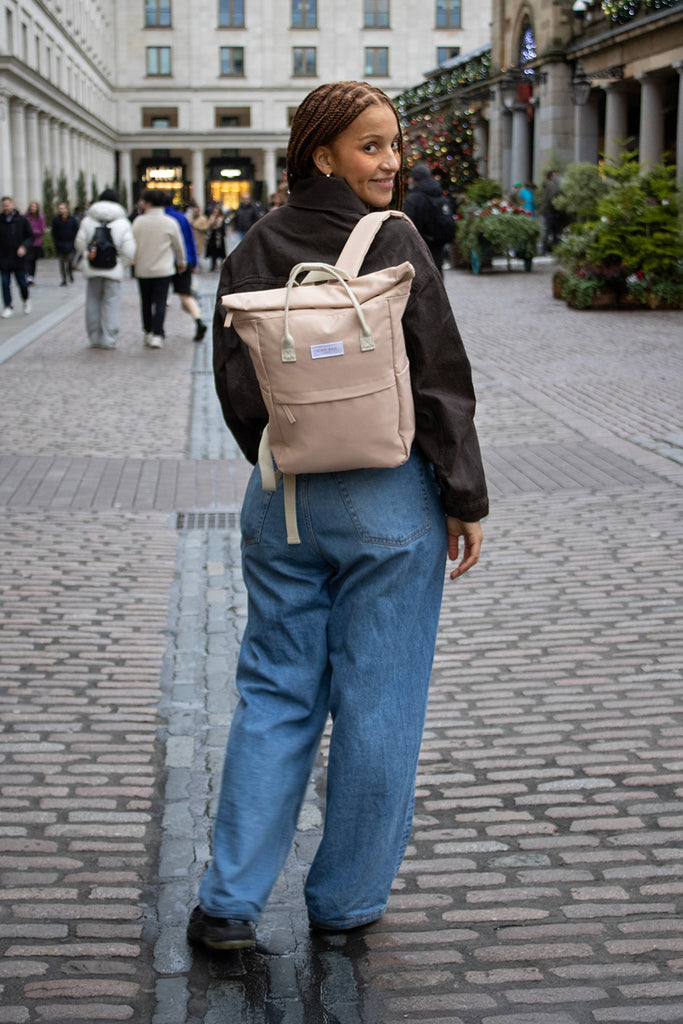 Introducing our next generation of Medium Hackney Backpack's, sustainably and ethically made from 100% recycled beige water-resistant fabric, now featuring a single larger front pocket. Retaining the streamlined design of the original, this updated version features contemporary enhancements for improved functionality and style. The roll-top closure with a zip and extra-strong magnets ensures secure and easy access to your belongings.