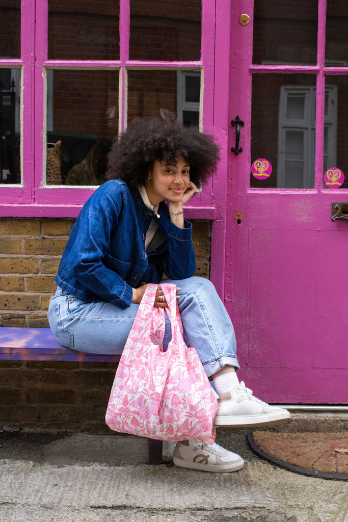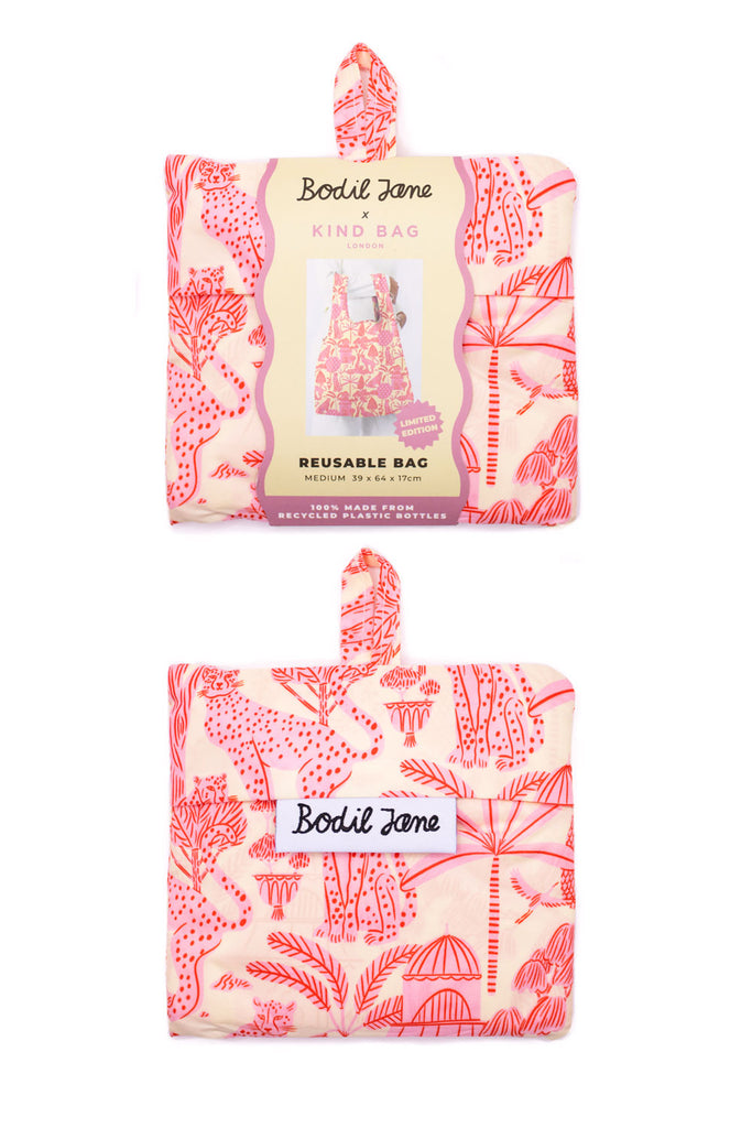 As the original Kind Bag product, our Reusable Bag is your go-to accessory for everyday use. Made from 100% recycled materials, it is lightweight yet capable of carrying up to 20kg. The built-in pouch allows you to fold the bag into a compact size for easy storage in your handbag or backpack. Ideal for grocery shopping, errands, and travel, this bag combines practicality with sustainability, ensuring you're never without a reusable bag. Designed in collaboration with artist Bodil Jane, it adds a playful, creative edge to your everyday.