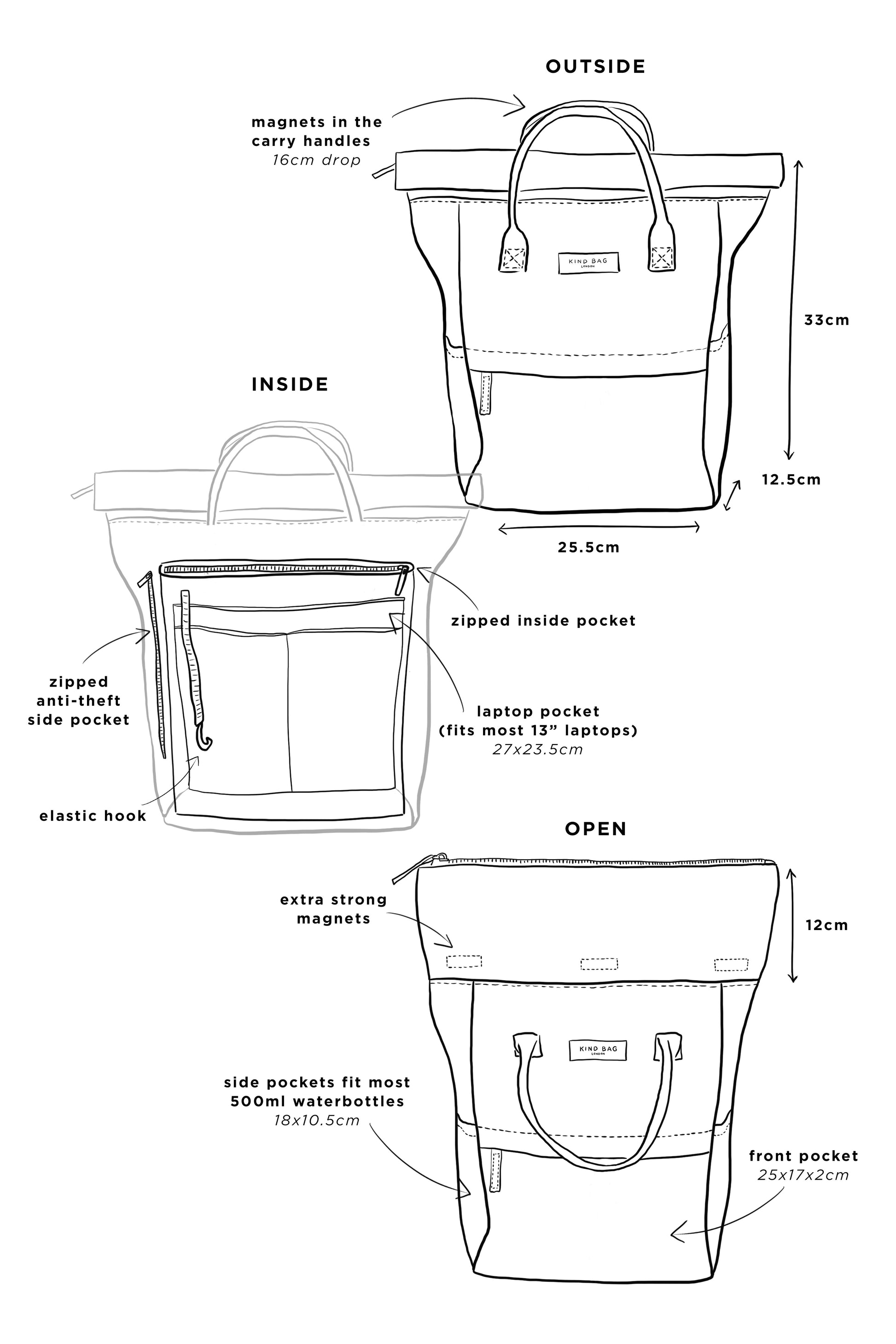 Dimensions: 33cm (+12cm roll top) x 25.5cm x 12.5cm.