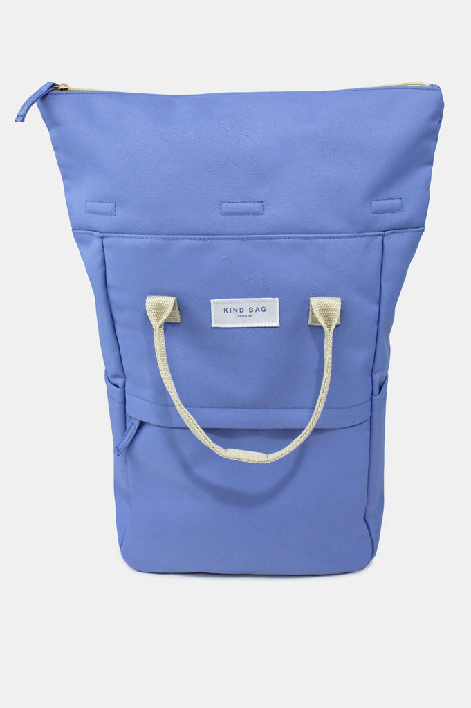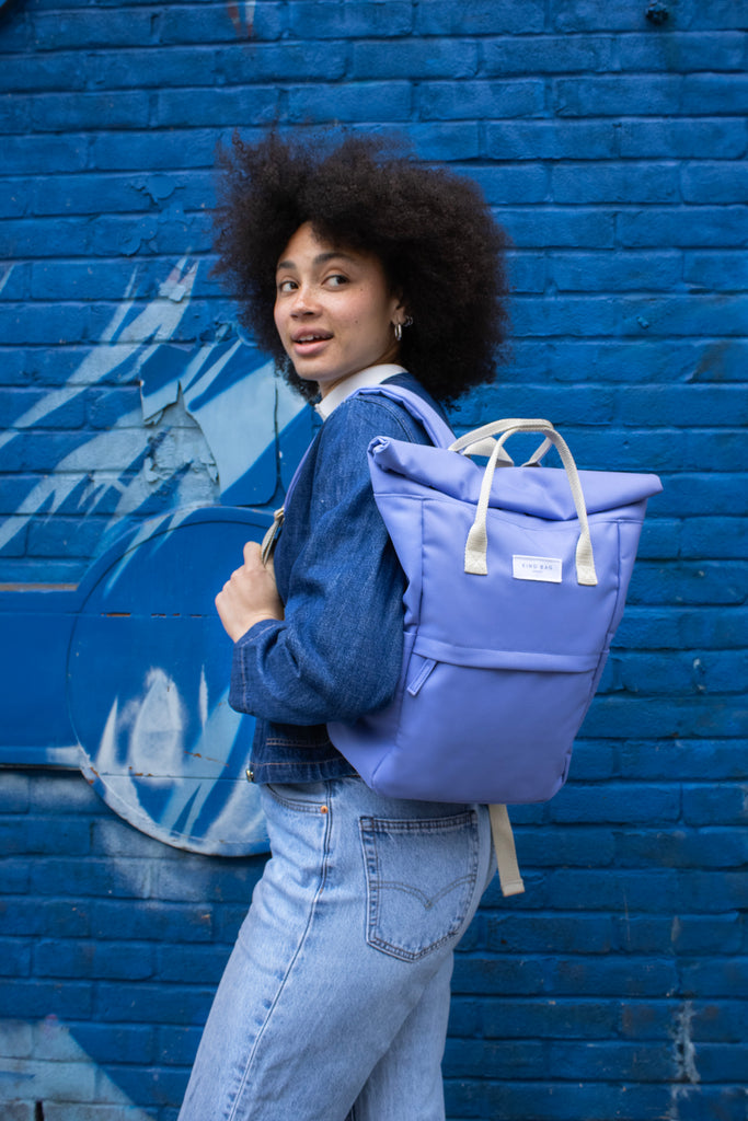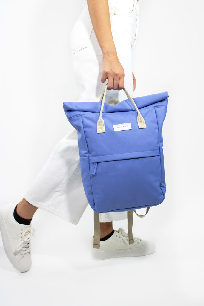 Introducing our next generation of Medium Hackney Backpack's, sustainably and ethically made from 100% recycled dusty blue water-resistant fabric, now featuring a single larger front pocket. Retaining the streamlined design of the original, this updated version features contemporary enhancements for improved functionality and style. The roll-top closure with a zip and extra-strong magnets ensures secure and easy access to your belongings.