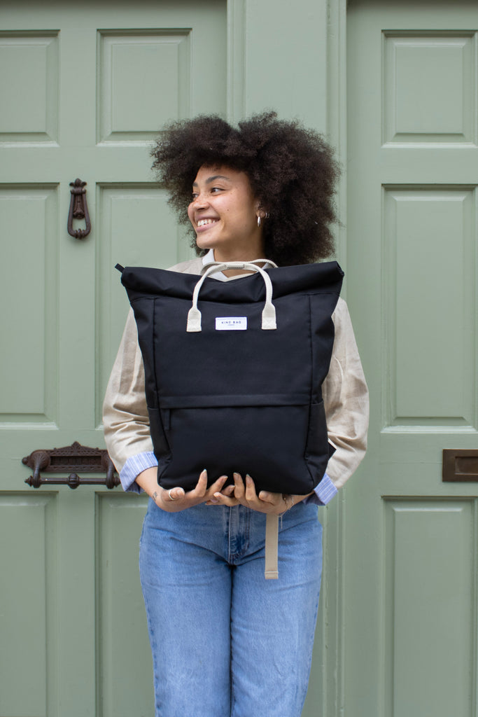 Your spacious, sustainable carry-all. Crafted from recycled, water-resistant fabric, the Large Hackney Backpack combines modern design with generous capacity. With a roll-top closure, padded laptop sleeve, comfy straps, and secure pockets, it’s the perfect conscious choice for work, travel, and everyday adventures.
