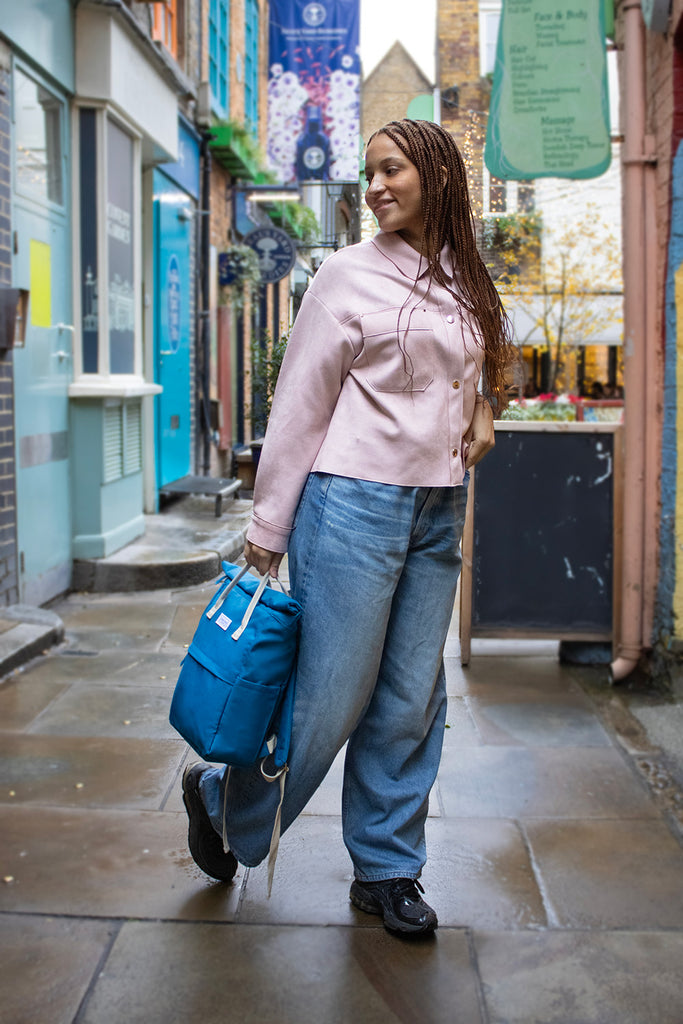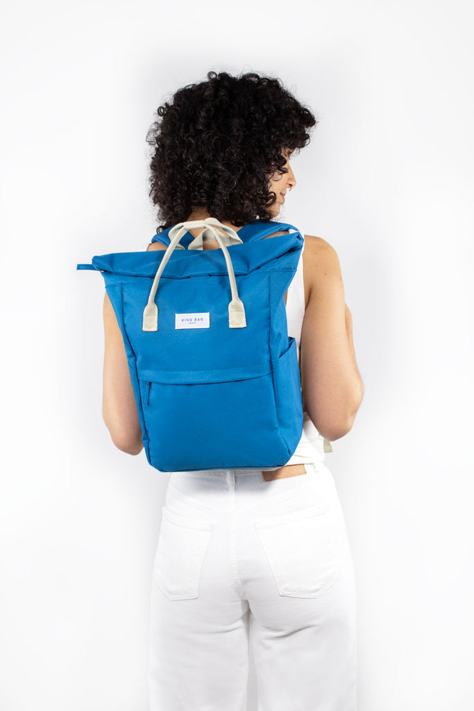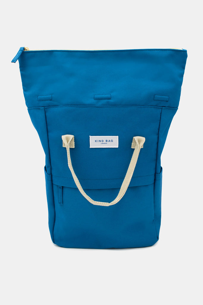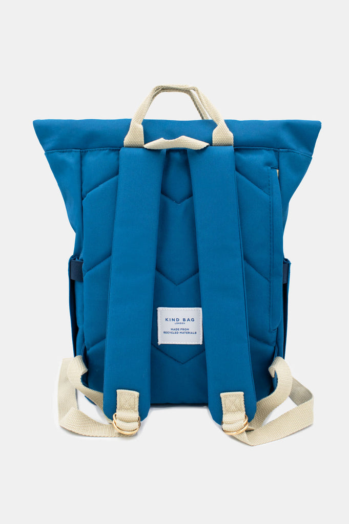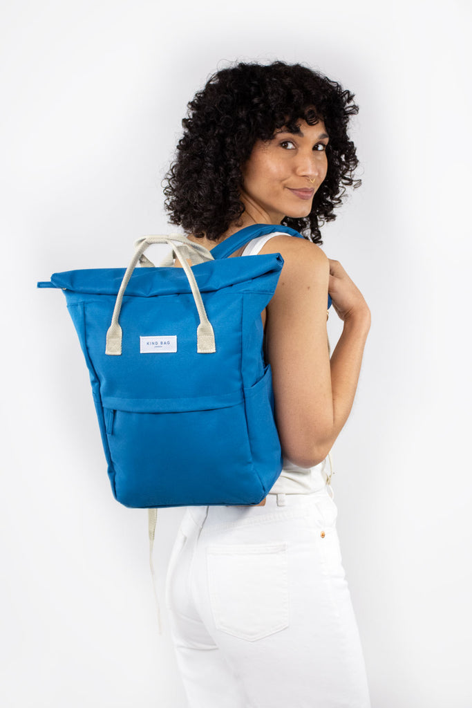 Introducing our next generation of Medium Hackney Backpack's, sustainably and ethically made from 100% recycled petrol blue water-resistant fabric, now featuring a single larger front pocket. Retaining the streamlined design of the original, this updated version features contemporary enhancements for improved functionality and style. The roll-top closure with a zip and extra-strong magnets ensures secure and easy access to your belongings.