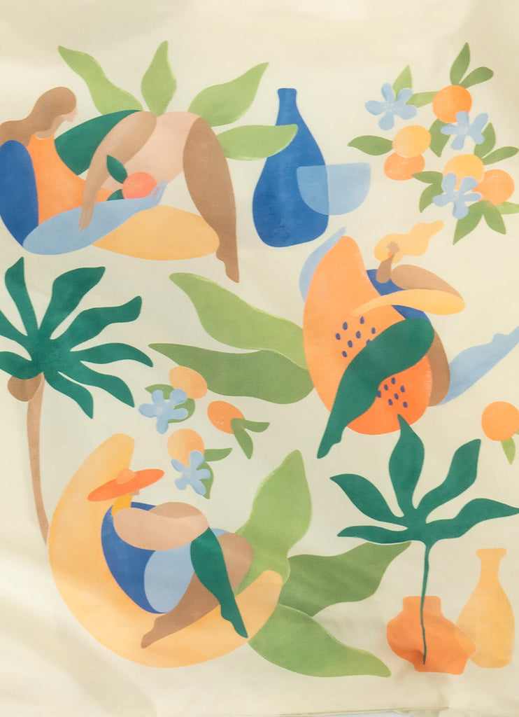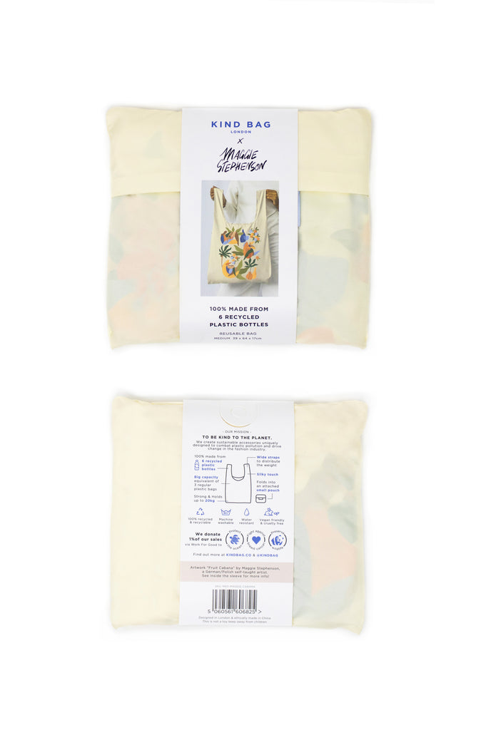Bring vibrant energy to your everyday with Maggie Stephenson’s Fruit Cabana. As the original Kind Bag product, our Reusable Bag is your go-to accessory for everyday use. Made from 100% recycled materials, it is lightweight yet capable of carrying up to 20kg. The built-in pouch allows you to fold the bag into a compact size for easy storage in your handbag or backpack. Ideal for grocery shopping, errands, and travel, this bag combines practicality with sustainability, ensuring you're never without a reusable bag.