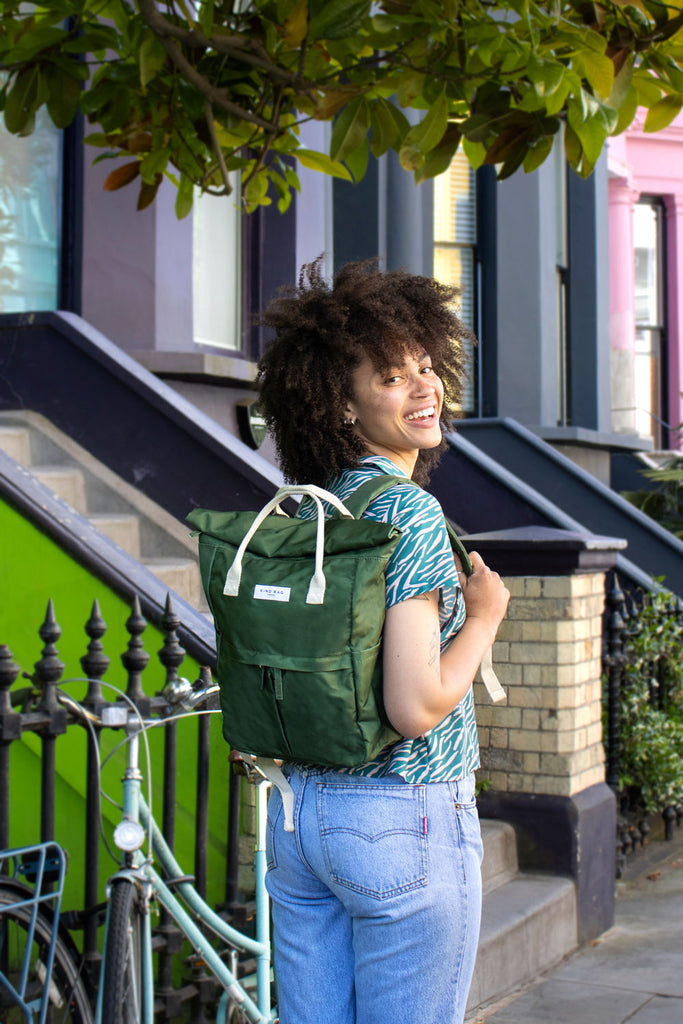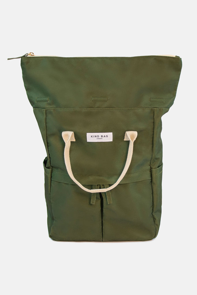 Introducing our next generation of Medium Hackney Backpack's, sustainably and ethically made from 100% recycled Khaki water-resistant fabric, now featuring a single larger front pocket. Retaining the streamlined design of the original, this updated version features contemporary enhancements for improved functionality and style. The roll-top closure with a zip and extra-strong magnets ensures secure and easy access to your belongings.