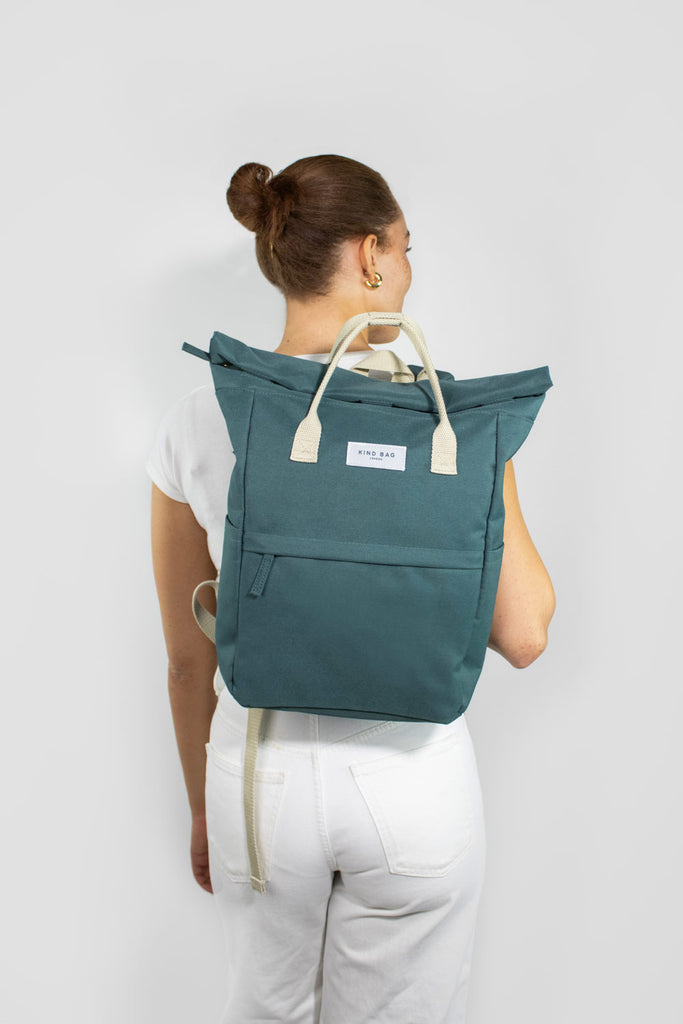 Introducing our next generation of Medium Hackney Backpack's, sustainably and ethically made from 100% recycled moss green water-resistant fabric, now featuring a single larger front pocket. Retaining the streamlined design of the original, this updated version features contemporary enhancements for improved functionality and style. The roll-top closure with a zip and extra-strong magnets ensures secure and easy access to your belongings.