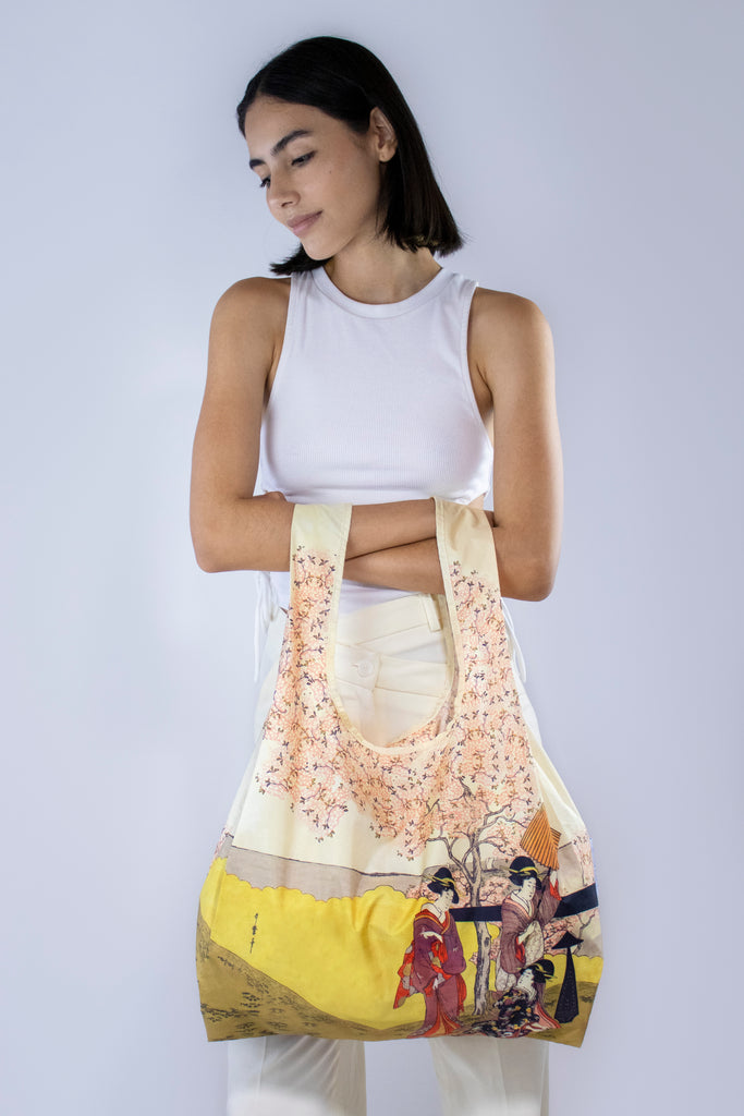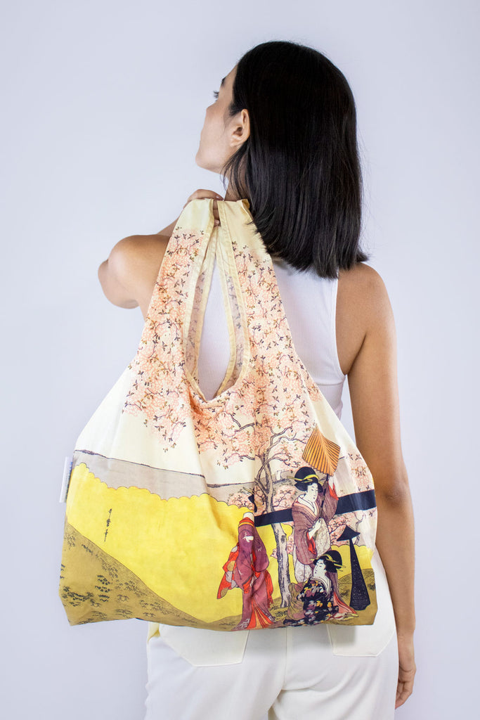 Celebrate the beauty of Japanese art with Kitagawa’s Gotenyama no Hanami Hidari. As the original Kind Bag product, our Reusable Bag is your go-to accessory for everyday use. Made from 100% recycled materials, it is lightweight yet capable of carrying up to 20kg. The built-in pouch allows you to fold the bag into a compact size for easy storage in your handbag or backpack. Ideal for grocery shopping, errands, and travel, this bag combines practicality with sustainability, ensuring you're never without a reusable bag.