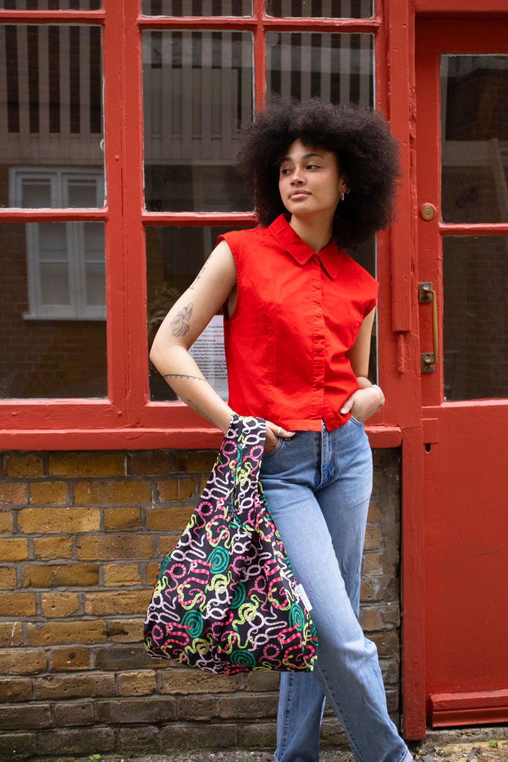 Your bag for every occasion. Lightweight, foldable, and made from recycled materials, it’s the one you’ll grab for groceries, errands, or weekends away — strong enough for heavy loads, yet compact enough to slip in your pocket. Designed in collaboration with artist Bodil Jane, it adds a playful, creative edge to your everyday.