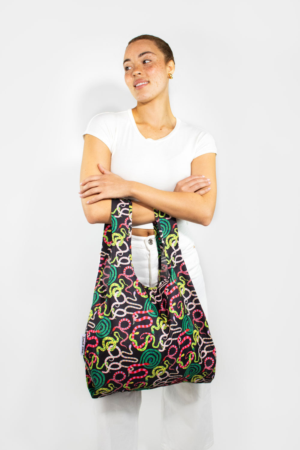 When not in use, the bag folds neatly into its attached built-in pouch, small enough to slip into your pocket or handbag, so you’ll always have a reusable option on hand.