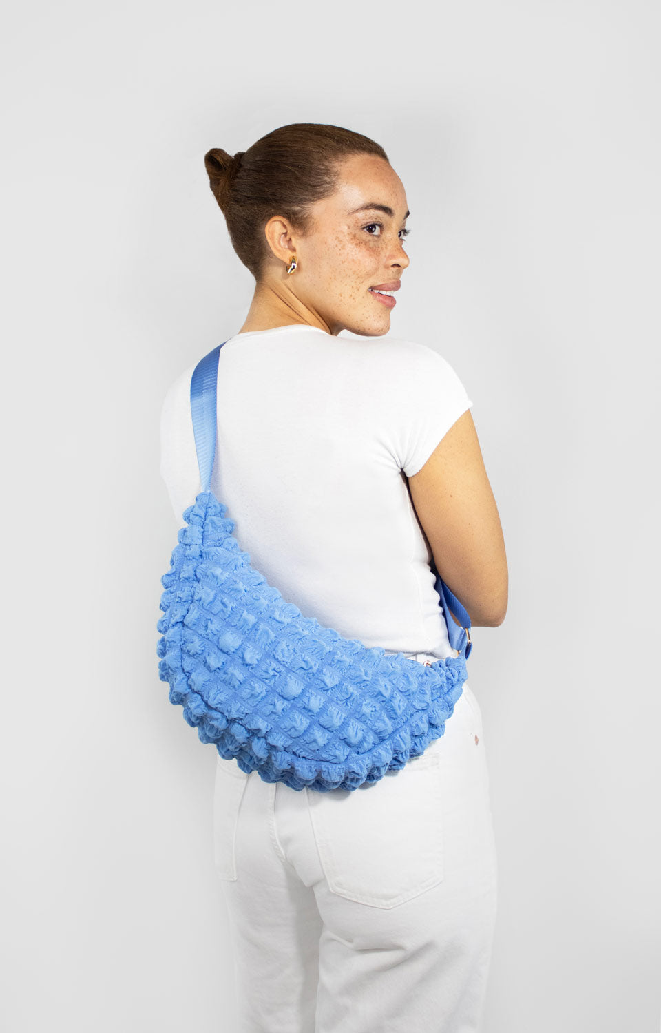 A waffle-textured sleek blue crossbody designed for comfort, organisation, and all-day confidence.