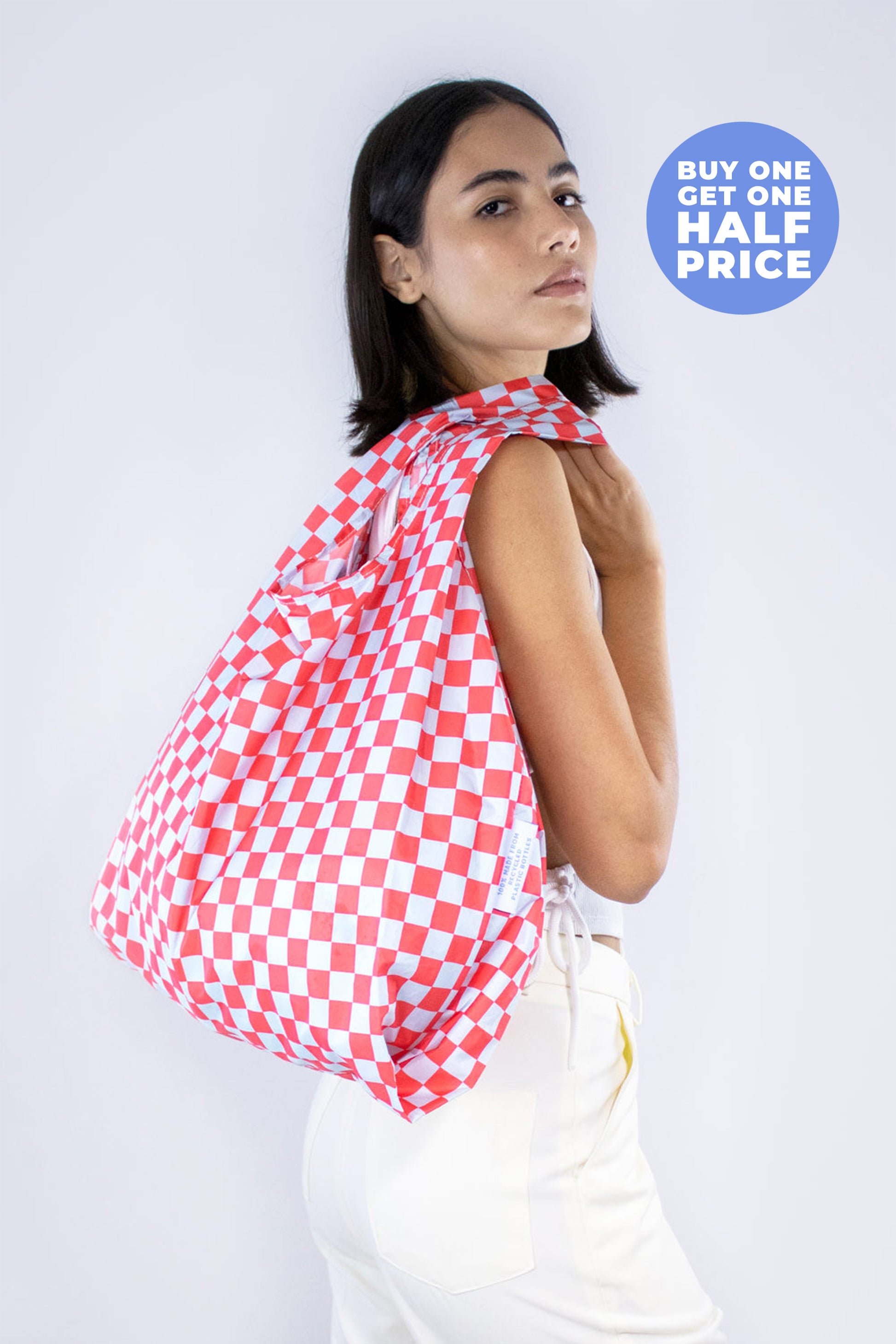 Lightweight, foldable, and endlessly versatile — this is the bag you’ll reach for on grocery runs, market hauls, or weekends away. Strong enough for heavy loads yet compact enough to tuck into your pocket, now finished in a bold checkerboard print.