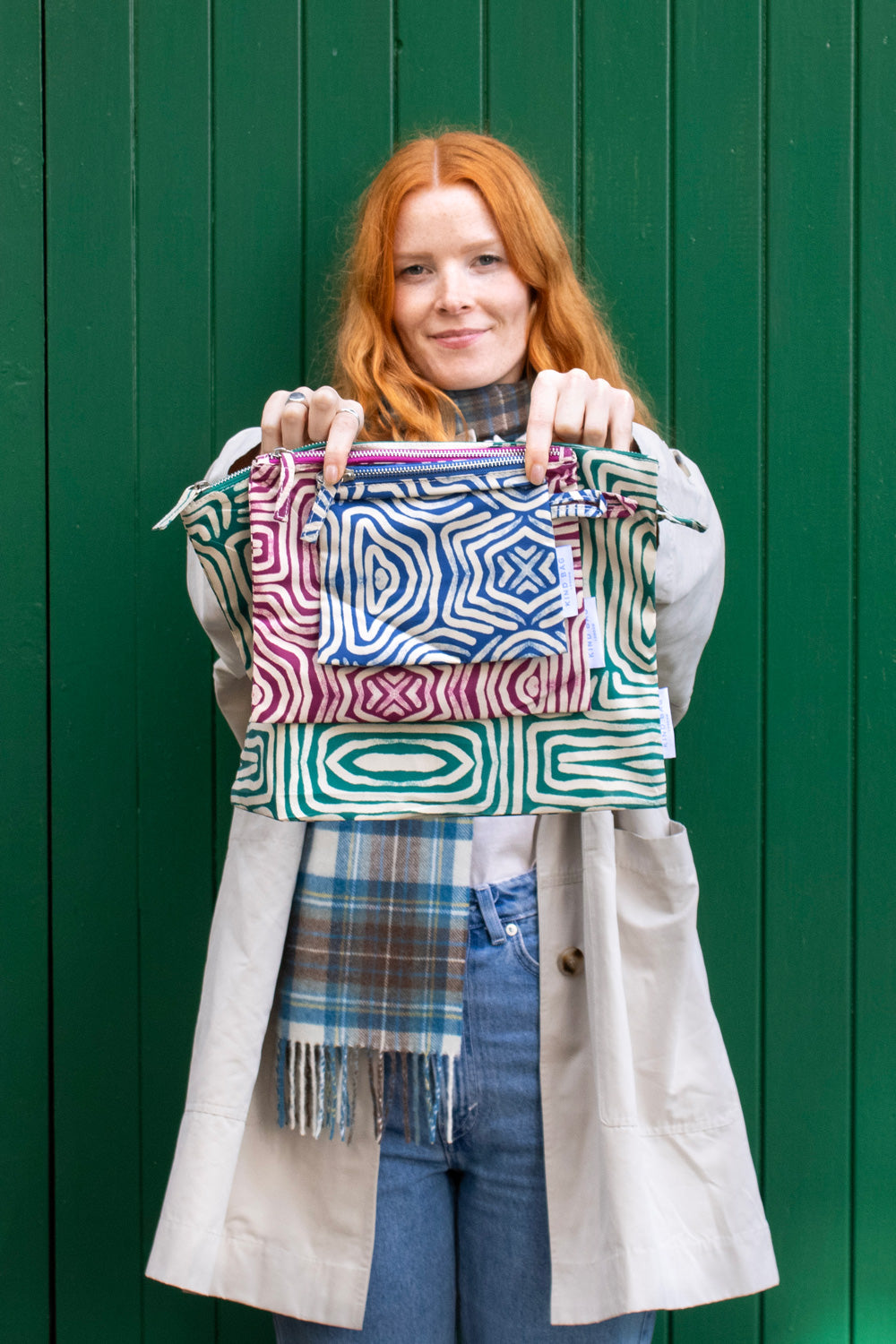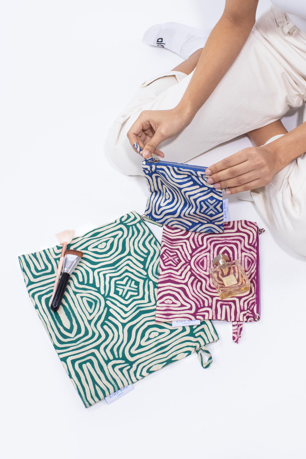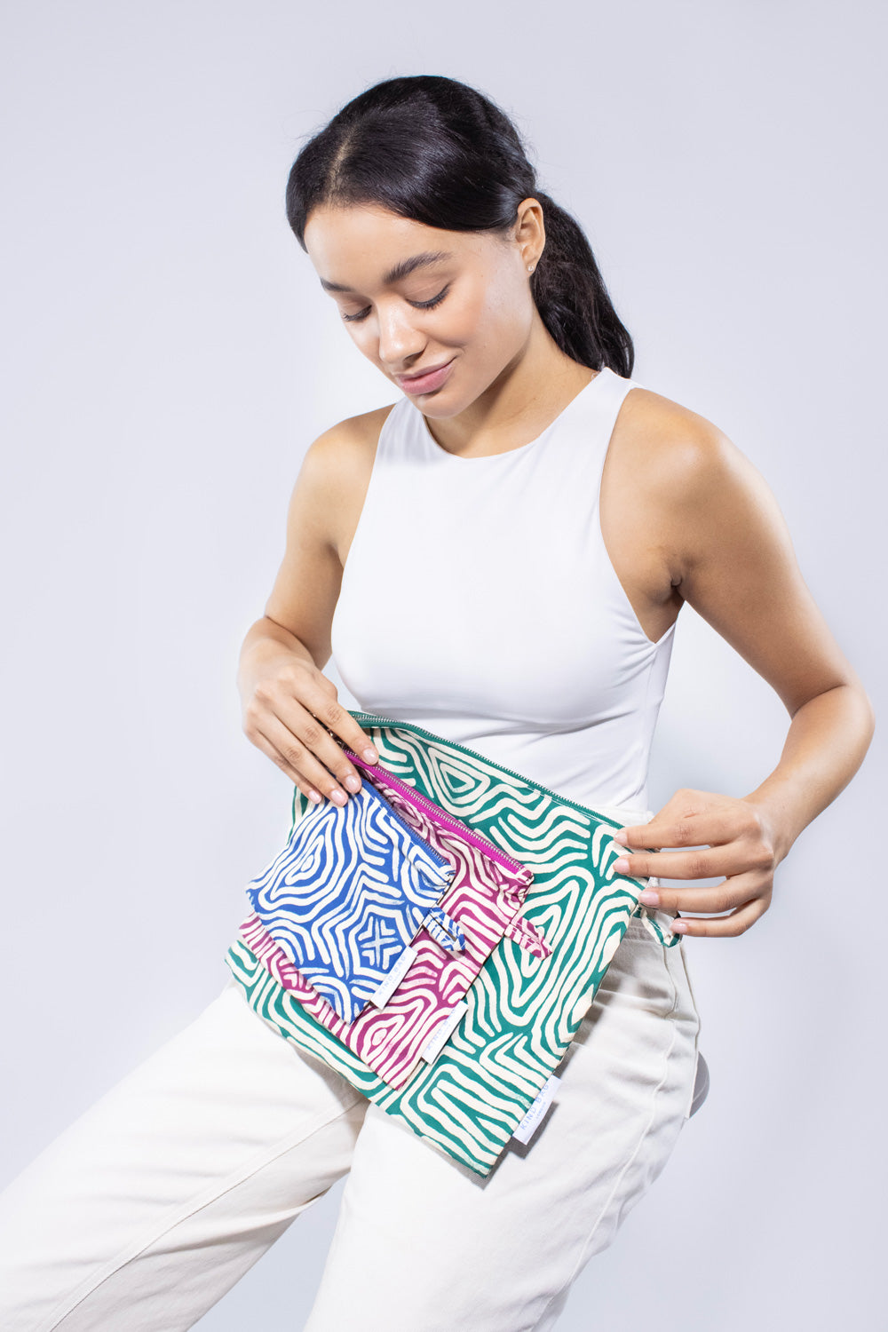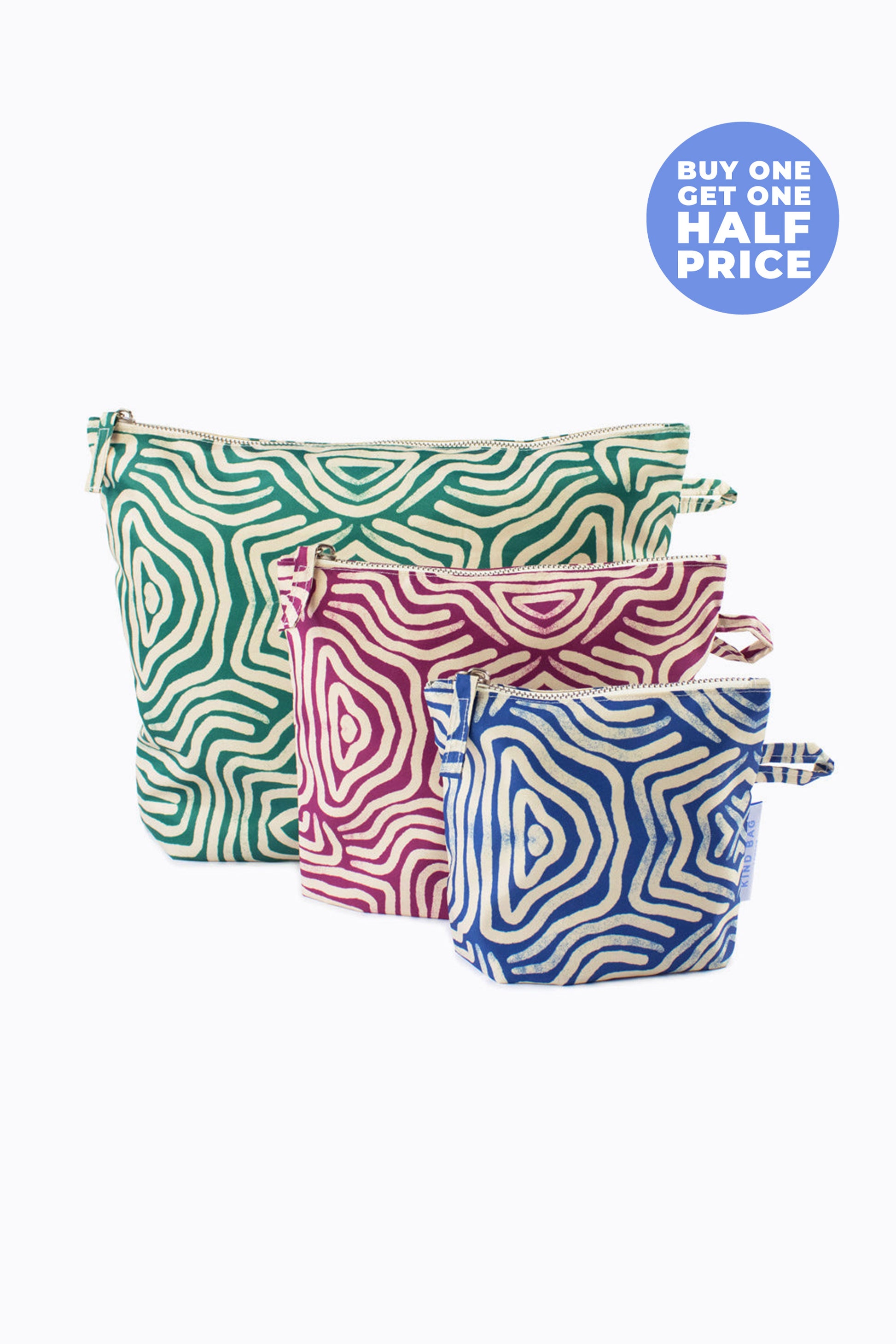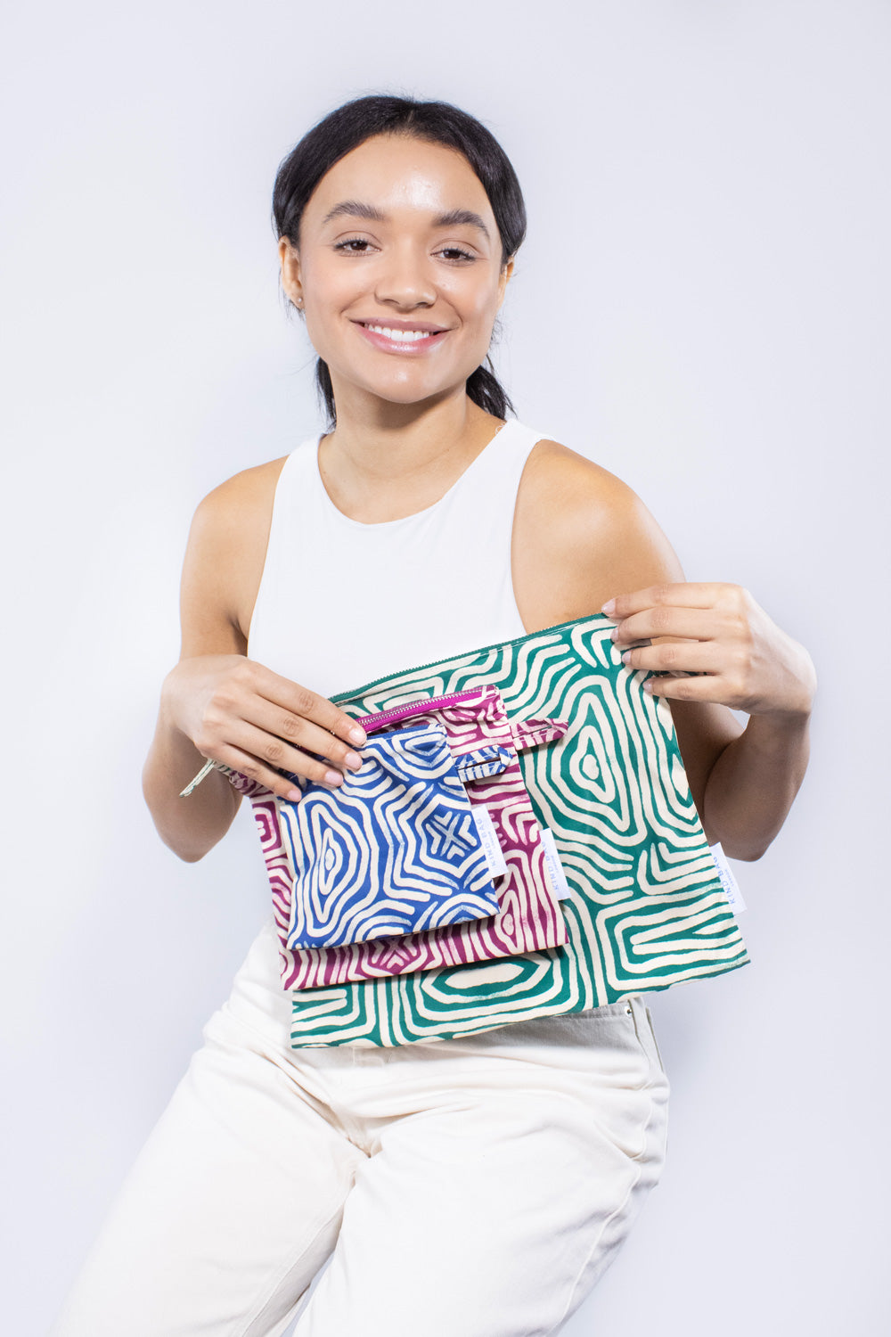 Our set of three Pouches is perfect for organising your essentials. Made from 100% recycled materials, these pouches come in different sizes to store everything from travel essentials to makeup and stationery. They lay flat when not in use, making them easy to pack and carry. Stay organised and eco-friendly with our stylish and versatile Pouches.